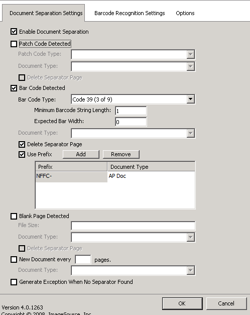 So this Tab does a few things. It enables document separation. It detects barcodes of the 3 of 9 flavor, it deletes what it determines are separator pages, and it uses a prefix (In our Case NFFC-) and assigns that to be the AP Doc document type. By using the Prefix other barcodes that don’t have the prefix will be ignored (so it won’t try separate on a vendors barcode for example)
