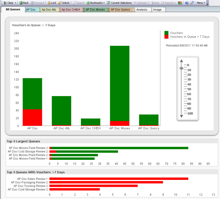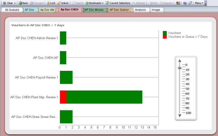 Using some Qlikview *’Magic*, we are to display the total invoices in the system by plant and analyze which are late ( in the queue longer than 7 days, adjustable by a slider) shown as red. Then we can click into a location, let’s pick on Chehalis.