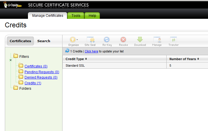 Now actually getting to where you can submit your certificate is a little bit cryptic. After you buy it, you go to the Manage Certificates and your like, so now what? So you click the Credits, and then you click the refresh arrow, and then your credit will show up.