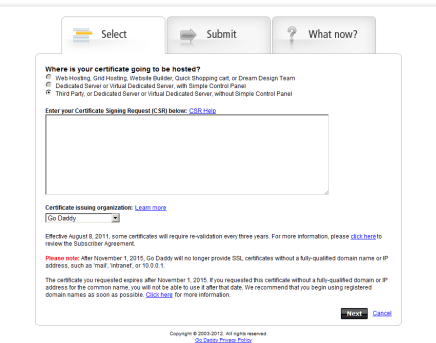 Ok Godaddy will chug on it for a while and then you need to prove that you own the domain. The easiest way was to click on the ‘whats the hold up’ link for go daddy and the create the simple little html file proving you own the site. After you have proved you own it, then you can download the certificate, and the godaddy bundle.