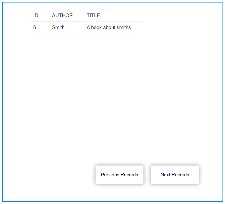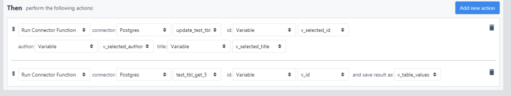 Next, lets make a button to get the next 5 records. Simply increment the ‘id’ counter, and re-run the connector function to overwrite the table variable.