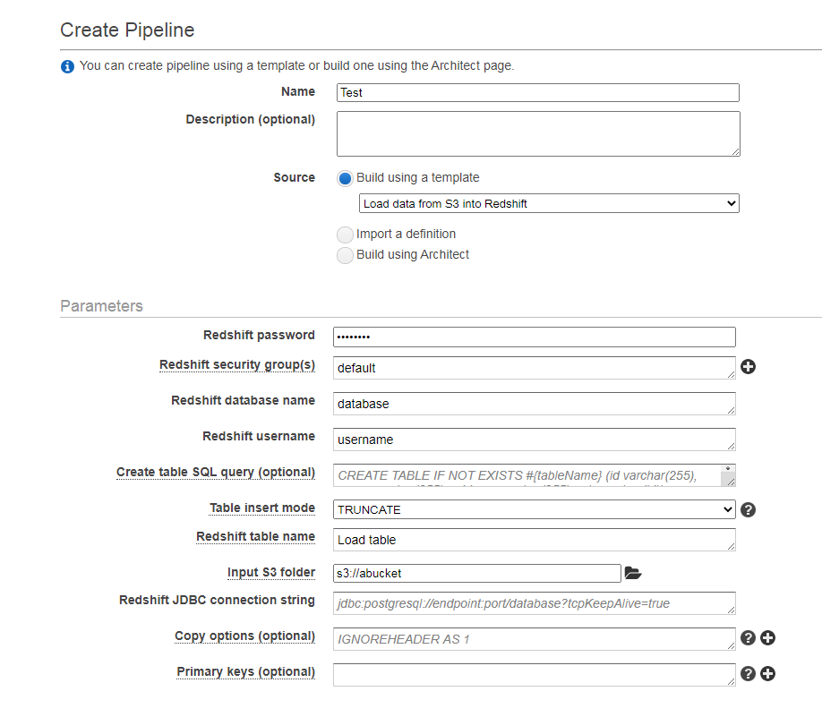 One quick way to get your feet wet is with the ‘Load data from S3 into redshift’ template