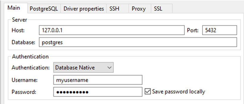 Fire up dbeaver or some other sql tool and sign into local host port 5432 with myusername and myuserpassword