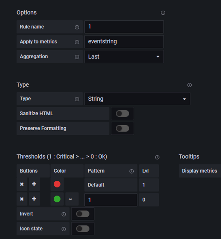 In apply to metrics if you delete everything there it gives you a picklist, choose event string. Change the type to string change the pattern to 1
