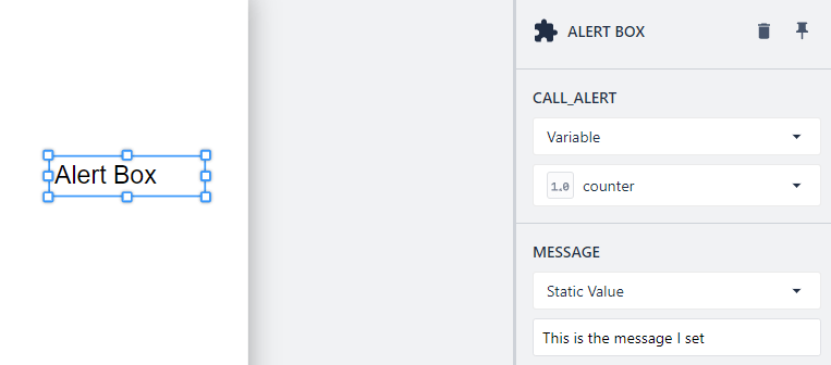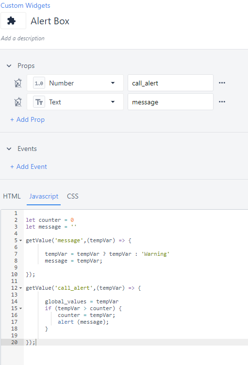 We can take advantage of triggering our alert javascript widget based on a change to a variable. (I did this through sending an incrementing number to a counter variable)