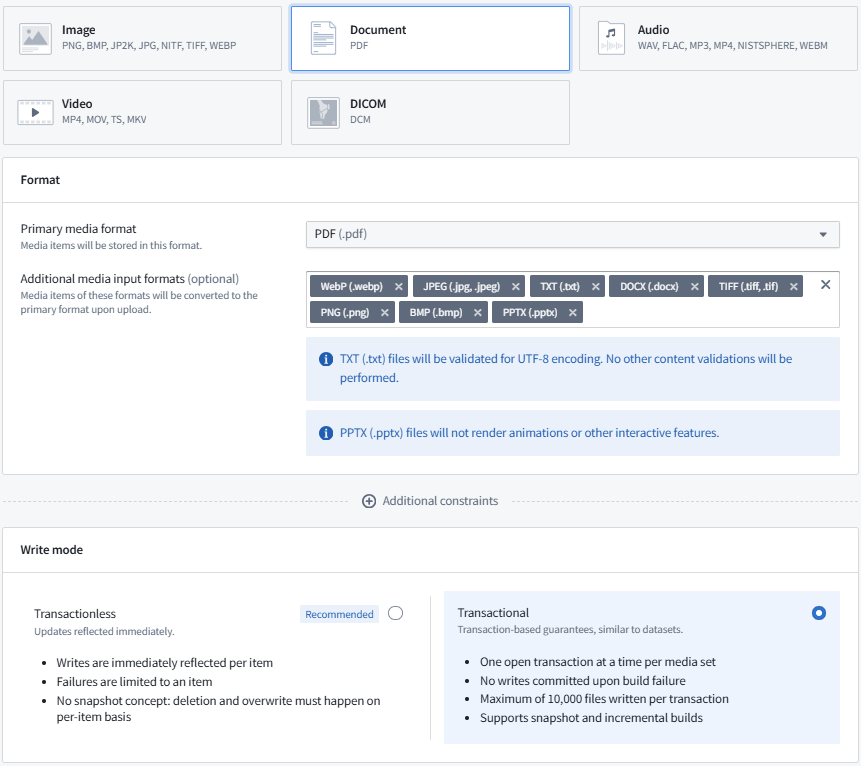 Media sets are interesting, they only support one ‘type’ of thing. One nice feature though is the ability to auto convert. When you create a media set, you can choose a Primary Media Format and then additional formats that are auto converted during upload. Also, for incremental support we want to choose Transactional write mode. I choose PDF with the idea that it will be easier to do extracts of things if needed later.