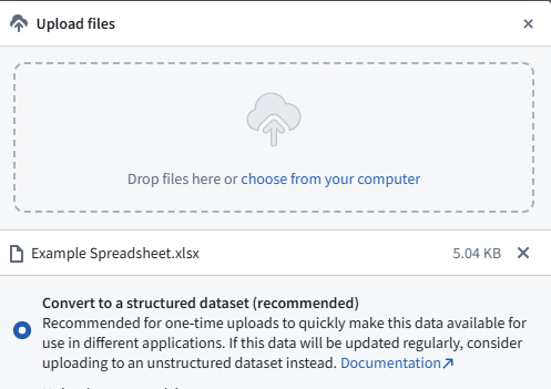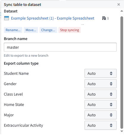 What is powerful about this method is that you can add and remove data, add and remove columns, and the dataset will automatically sync! Of course changing columns will break downstream pipelines and things. One thing to note, it tries to guess at your data types. It sometimes decides that your data type is a decimal… which is not compatible with ontology edits etc.. if you want more control over this under Data choose, Sync table to dataset