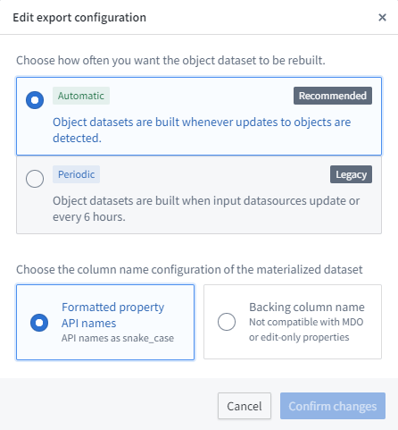 This creates a dataset of your objects (with edits) that then you can pipeline to another dataset (if needed) and then use a new beta feature ‘Table exports’ (It supports MSQL server, Postgres, Oracle, and some SaaS)