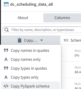 The schema needs to match EXACTLY, so my easy button is to go to the dataset, click on Columns and then Copy PySpark schema. I then copy this into an LLM and ask it to convert it to a postgres table creation script, easy-peasy. (Timestamps as timestamptz)