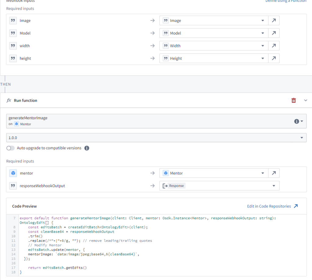Create an action to call this webhook, and writeback to the mentor image property.