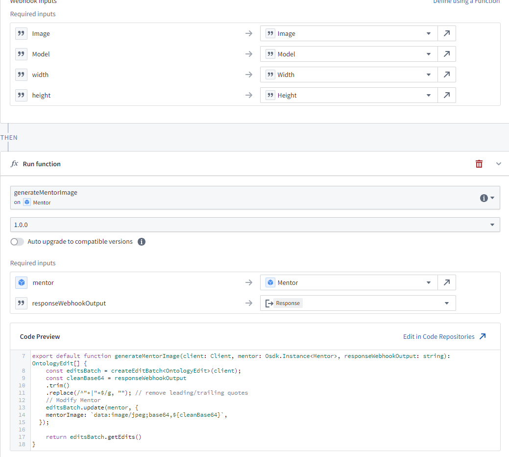 Create an action to call this webhook, and writeback to the mentor image property.