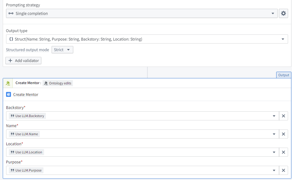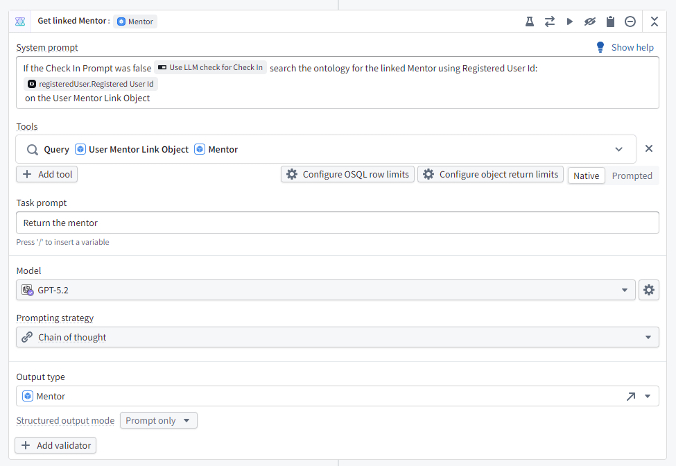 Ok, lets make a mentor. Fire up AIP Logic. Let’s have only the purpose be user defined, and the rest derived.