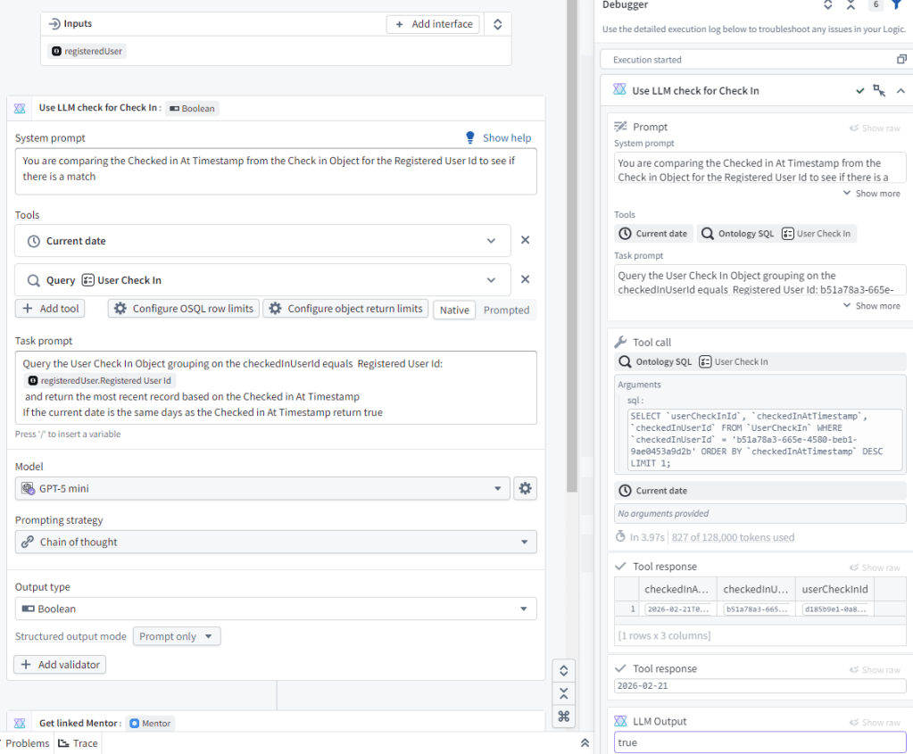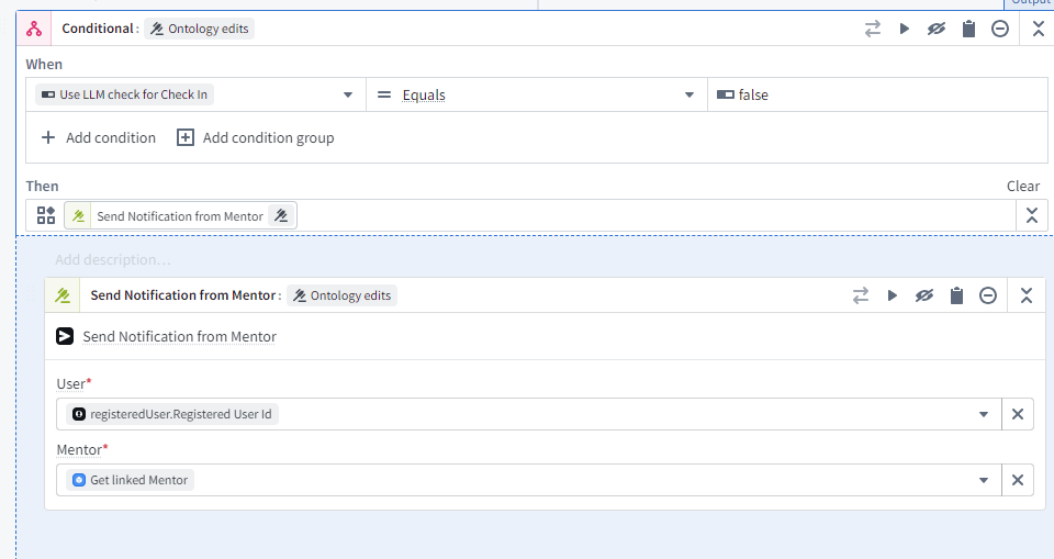 Finally we go to automate, we want to pass in a set of Active registered users, and then for each one run the Check for Check In AIP logic, which if it finds you haven’t checked in will send out the notification.