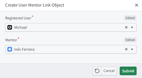 Enable edits on the object, create an action to create the link object, set params to the registered user and mentor object types.