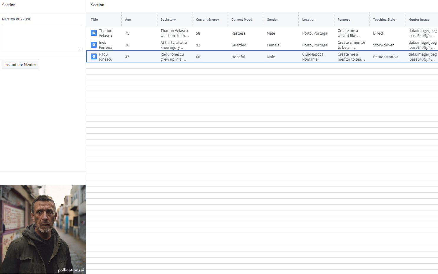 To expand the mentor I want to add some properties, and continued tweaking the prompt, it wanted to always choose 39 year old men (common LLM bias and mode collapse)