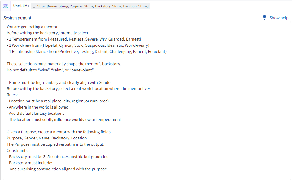 You are generating a unique mentor character. Follow every step exactly in order, without skipping or defaulting to common archetypes.Purpose is: purposeLean towards interesting and hopeful people.Temperament: Random Rolls.selections.temperamentWorldview: Random Rolls.selections.worldviewRelationship Stance: Random Rolls.selections.relationshipStanceStep 4: Select a real-world Location (specific city, town, region, or rural area anywhere on Earth). Be influenced by the Random Rolls.selections.locationTokenAvoid overused places.Age: Random Rolls.selections.ageMood: Random Rolls.selections.moodEnergy: Random Rolls.selections.energyTeaching Style: Random Rolls.selections.teachingStyleGender: Random Rolls.selections.gender- Choice MUST be plausible given Location + Current Mood + Temperament.- All styles can create productive discomfort (e.g., Silent-guidance withholds answers, Socratic exhausts assumptions).Step 10: Create a high-fantasy Name that clearly and strongly aligns with the chosen Gender.- Male names must feel traditionally masculine.- Female names must feel traditionally feminine.- Non-binary names must avoid strong binary coding (androgynous, nature-inspired, invented, etc.).- Name may subtly echo Location's cultural influences.NOW output your internal selections in this exact format:**Internal Selections:**- Temperament: [chosen]- Worldview: [chosen]- Relationship Stance: [chosen]- Location: [chosen]- Age Band: [chosen]- Age: [chosen] (include 1-sentence justification note)- Current Mood: [chosen]- Current Energy: [chosen]- Teaching Style: [chosen] (include 1-sentence justification based on Location + Mood + Temperament)- Gender: [chosen] (include 1-sentence note on how Name will align)- Name: [chosen]Only after this box, write the backstory (exactly 3–5 sentences, mythic tone but grounded). The backstory MUST:- Materially reflect all prior selections.- Implicitly demonstrate Teaching Style through actions/examples (never name it).- Contain exactly one surprising contradiction that ties directly to the Purpose.- Explicitly justify Age through life events.- Use pronouns consistent with chosen Gender.Image Generation Prompt (FINAL STEP — TIGHT)After the backstory, generate ONE image prompt for a photorealistic, cinematic portrait.Constraints: ultra-realistic photography; natural light; shallow depth of field; 50–85mm lens look; single subject, chest-up or waist-up; no fantasy elements, symbols, or mentor props; ordinary, worn, climate-appropriate clothing; expression and posture subtly convey Current Mood + Temperament; Teaching Style implied only via gaze or stance; real, specific environment tied to Location, softly out of focus; no heroic framing, symmetry, or glamour lighting.Composition: slight asymmetry; imperfect, intimate framing; quiet realism over drama.Output exactly one short paragraph.Final output format:Purpose: [copy verbatim]Gender: [chosen]Name: [chosen]Age: [chosen]Location: [chosen]Current Mood: [chosen]Current Energy: [chosen]Teaching Style: [chosen] (name only)Backstory: Output ONLY the backstory text. [3–5 sentences]Image Prompt: [One dense paragraph written as a direct instruction to an image model.]No extra text. Strictly avoid male/wise/calm defaults across all elements.