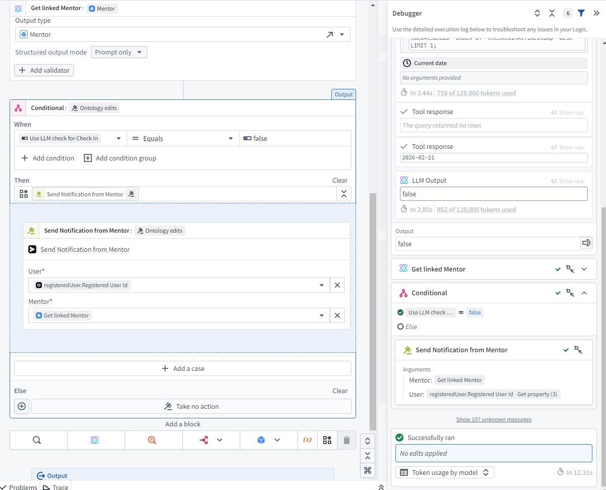 Finally we go to automate, we want to pass in a set of Active registered users, and then for each one run the Check for Check In AIP logic, which if it finds you haven’t checked in will send out the notification.
